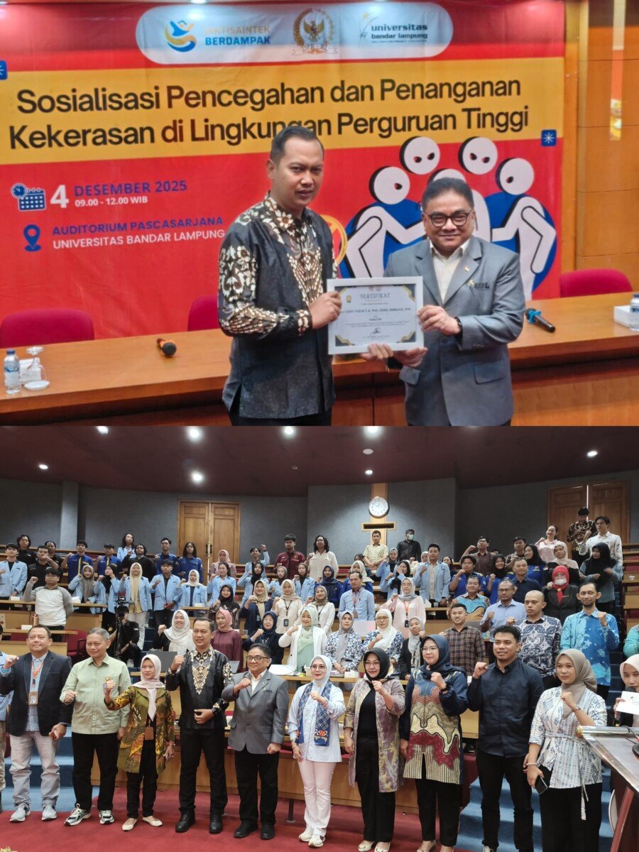 Bandar Lampung – Auditorium Pascasarjana Universitas Bandar Lampung menjadi lokasi penyelenggaraan Sosialisasi Pencegahan dan Penanganan Kekerasan di Lingkungan Perguruan Tinggi, Kamis (4/12/2025). Kegiatan ini merupakan kolaborasi antara Komisi X DPR RI, Kemendiktisaintek, dan Universitas Bandar Lampung.