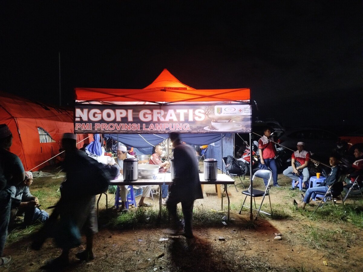 Sebagai bentuk kepedulian terhadap jamaah yang mengikuti rangkaian kegiatan hingga malam hari, PMI Lampung mendirikan tenda pelayanan dengan menyediakan kopi panas, teh hangat, dan makanan ringan berupa singkong rebus. Seluruh hidangan tersebut dibagikan secara gratis kepada peserta yang datang bergantian.