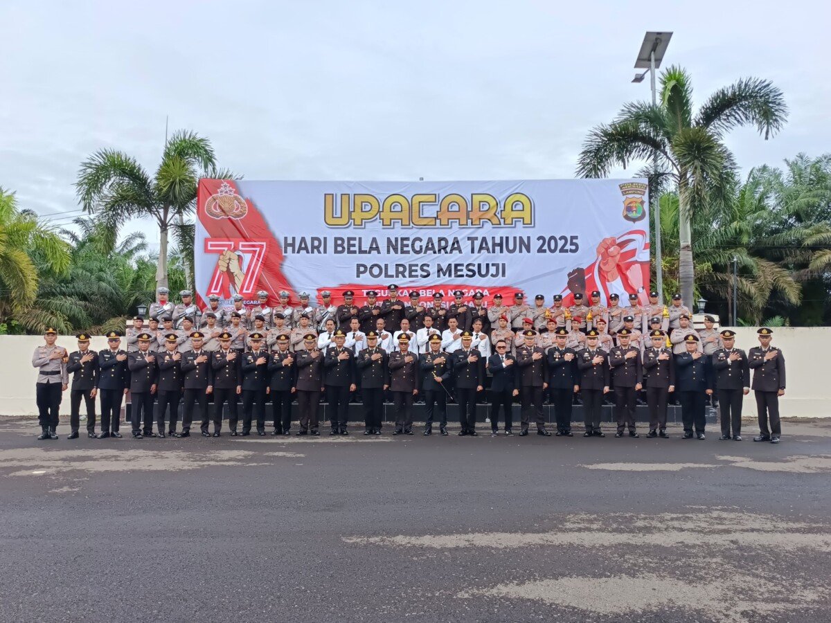 MESUJI //– Lapangan apel Mapolres Mesuji pagi ini dipenuhi oleh jajaran personel Polres Mesuji yang tampil rapi dalam pakaian dinas seragam. Mereka berkumpul untuk melaksanakan upacara peringatan Hari Bela Negara (HBN) ke-77 dengan tema “Teguhkan Bela Negara Untuk Indonesia Maju”. Jumat (19/12/2025).