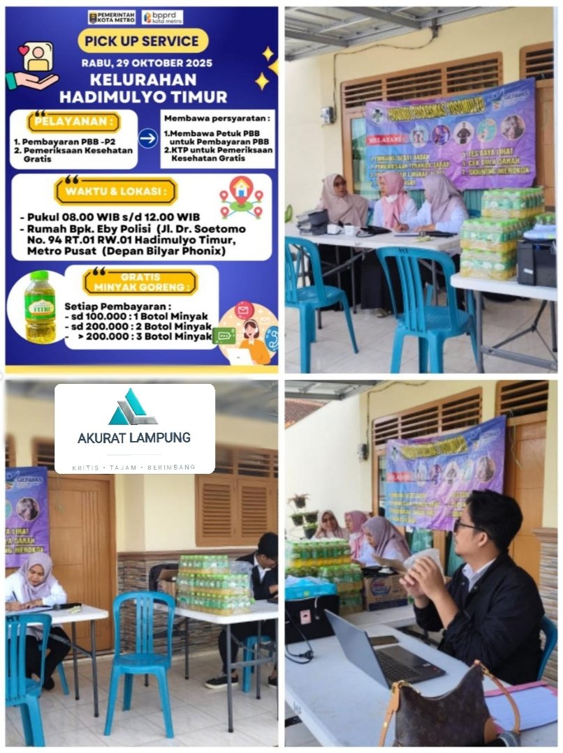 KOTA METRO – Dalam upaya meningkatkan pelayanan kepada masyarakat, Kelurahan Hadimulyo Timur, Kecamatan Metro Pusat, mengadakan kegiatan “Pick Up Service” pembayaran Pajak Bumi dan Bangunan Perdesaan dan Perkotaan (PBB-P2) serta cek kesehatan gratis bagi warga pada Rabu (29/10/2025).